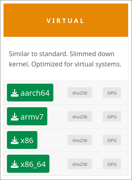 Scroll down to where it says ‘virtual’ and select a version that matches your architecture (NetBird is currently available on all architectures Alpine is). Choosing the virtual image will give us automatic serial support, which speeds up the setup process significantly.