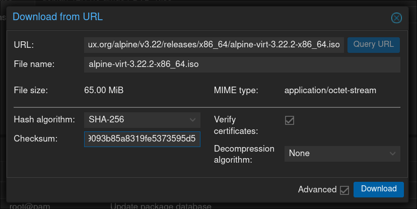 The first step is to download the version of Alpine we’ll be using to Proxmox. You can find download page here.