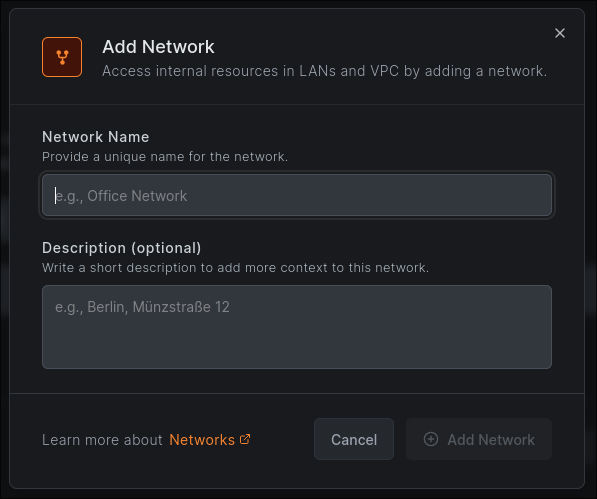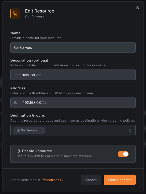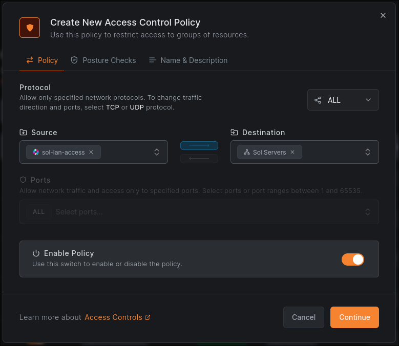 You should now be able to see the host in your NetBird dashboard, and more importantly, we can set it up as a routing peer. Navigate to the ‘Networks’ tab, and either set up a new network or select an existing one. 10.png If you’re creating a new network, make sure to add some resources like so: 11.png To actually have peers access our resources, we’ll also need to set up ACLs. This is done under the ‘Access Control -> Policies’ tab and can be as simple as mapping a resource to a group or role assigned by your identity provider. The example below lets anyone with the role ‘sol-lan-access’ access the ‘Sol Servers’ resource from before. 12.png The important part of this is having at least one device that can’t access your resources without using the VPN so we can use it to test, and making sure this device is allowed through by NetBird’s ACLs.