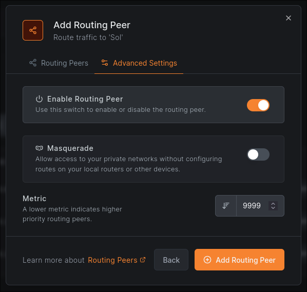 Towards the bottom of the network settings should be an option to add a new routing peer which allows us to actually use the network by sending traffic from NetBird through this device. 13.png You can choose to add the peer individually, or you can choose to use a whole group as routing peers for the network. In this case, any new routing peer just needs to be added to the group. If you’re following my setup and intend to disable NATing (explained soon), you’ll need to add peers individually. 14.png After this we can configure advanced settings. The main important option here is ‘Masquerade’. If you have a simple lab setup that only you use, it’s fine to leave this on, however if you’re setting up NetBird for a business or a large lab with multiple users, I highly recommend disabling it. Take note of the ‘Metric’ setting too, because if you do choose to work without NAT, you’ll need to adjust this later.