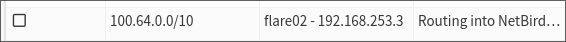Routes are accessible in ‘System > Routes > Configuration’. Setting one up is pretty simple, just define one using your new gateway like so: 17.png NetBird runs a network somewhere in the 100.64.0.0/10 range, so if you don’t have other networks in this range, you can route any traffic from this range into your routing peer and have it sent to NetBird. If you want to be more specific, NetBird uses a /16 network inside this range. You can find this by checking the NetBird IP of any of your devices. It will look like 100.xxx.yyy.zzz. To route specifically to this network, your network address should be 100.xxx.0.0/16.