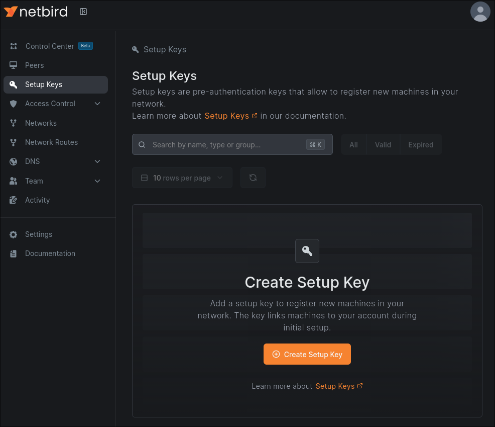 The first thing we’ll do is navigate into NetBird and create a setup key. This means this peer won’t be attached to a particular account, which works well in my setup. We can also prevent its session from expiring, meaning if it goes down it can automatically come back up without us having to give it a new key. 7.png Click the ‘Create Setup Key’ button and create your key. I recommend making this a one-time use and giving it a short expiry if you don’t need to deploy new hosts en masse. 8.png