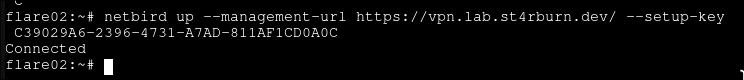 $ netbird up --management-url <YOUR MANAGEMENT URL> --setup-key <YOUR SETUP KEY>